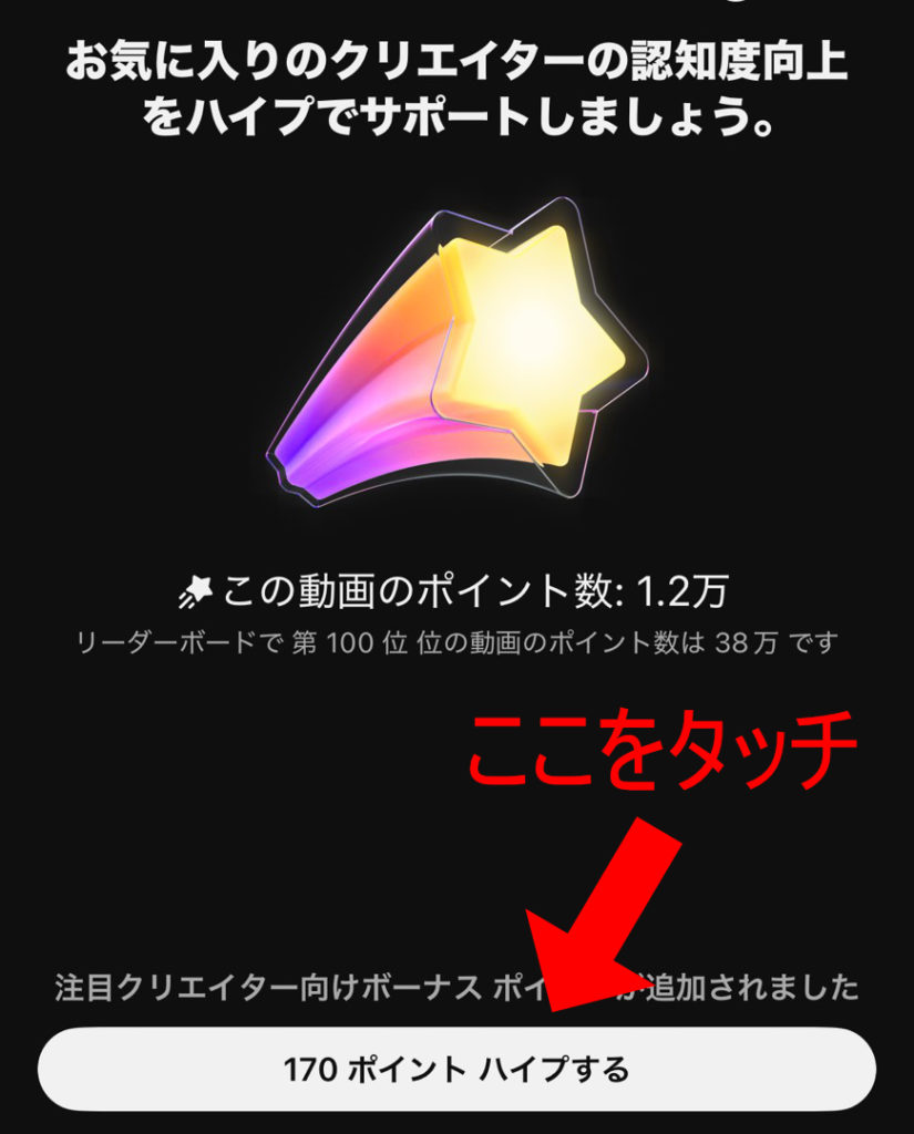 タッチすると次の画像になり「○○ポイント ハイプする」と出てきますので、そちらをタッチすると応援完了です♪